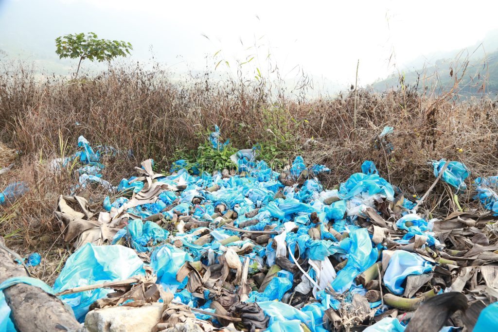 Sau khi thu hoạch, các buồng chuối được bóc lớp nilon bảo vệ để đóng lên xe tải vận chuyển đi tiêu thụ. Túi nilon không sử dụng nữa lập tức trở thành rác thải bị bỏ mặc tại chỗ.